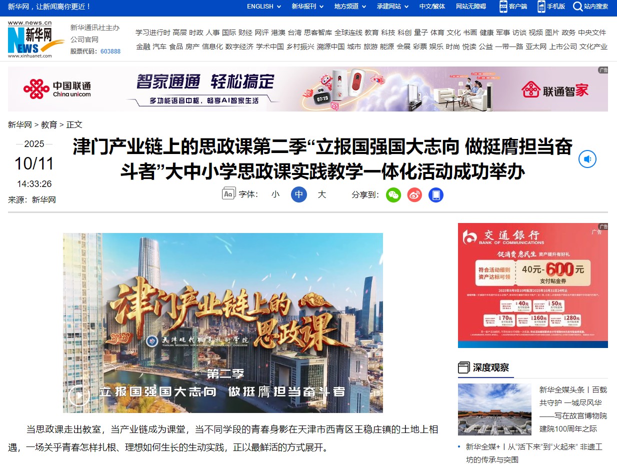 近日,在天津市委教育工委、市教委的指導下,由天津現代職業技術學院黨委牽頭,天津市職業學校思政課建設協作組、天津市“大思政課”實踐教學聯盟、天津海河教育園區思政聯盟、天津市中高職思政課教師研究與培訓中心、南開大學馬克思主義學院、天津鐵道職業技術學院、天津市第一中學、天津市岳陽道小學等參與的“立報國強國大志向,做挺膺擔當奮斗者——津門產業鏈上的思政課”正式開講。