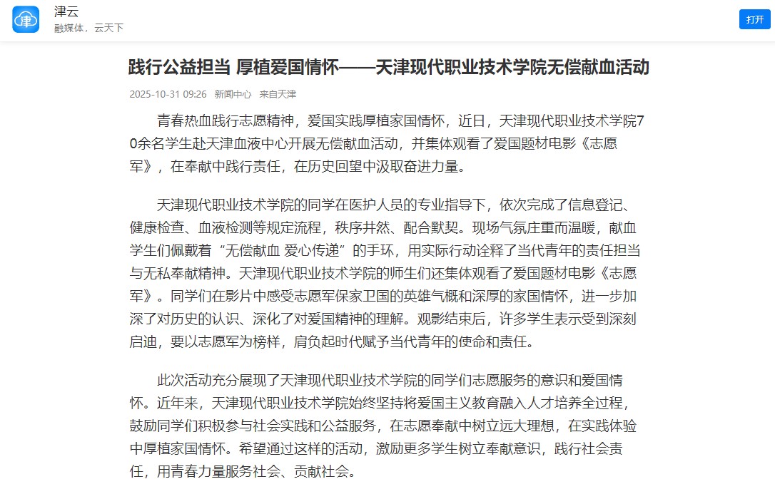 青春熱血踐行志愿精神,愛(ài)國(guó)實(shí)踐厚植家國(guó)情懷,近日,天津現(xiàn)代職業(yè)技術(shù)學(xué)院70余名學(xué)生赴天津血液中心開(kāi)展無(wú)償獻(xiàn)血活動(dòng),并集體觀看了愛(ài)國(guó)題材電影《志愿軍》,在奉獻(xiàn)中踐行責(zé)任,在歷史回望中汲取奮進(jìn)力量。