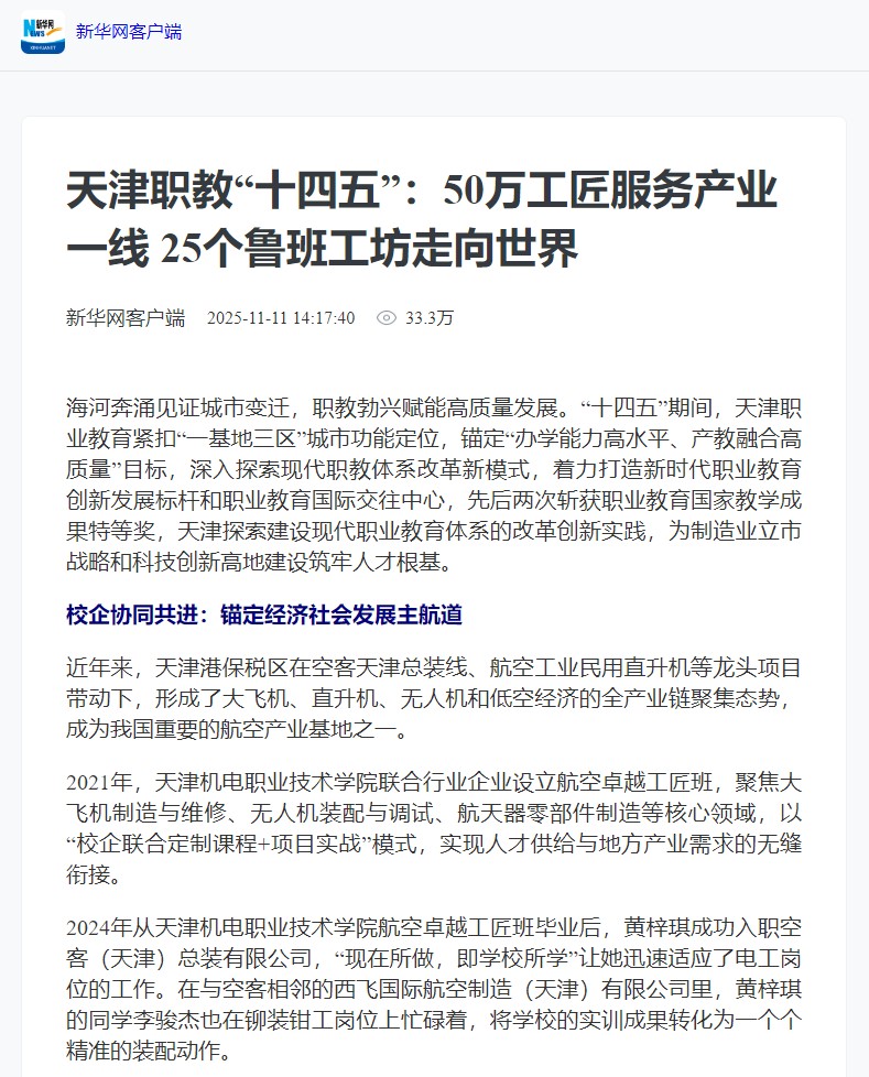 2021年,天津機電職業技術學院聯合行業企業設立航空卓越工匠班,聚焦大飛機制造與維修、無人機裝配與調試、航天器零部件制造等核心領域,以“校企聯合定制課程+項目實戰”模式,實現人才供給與地方產業需求的無縫銜接。
