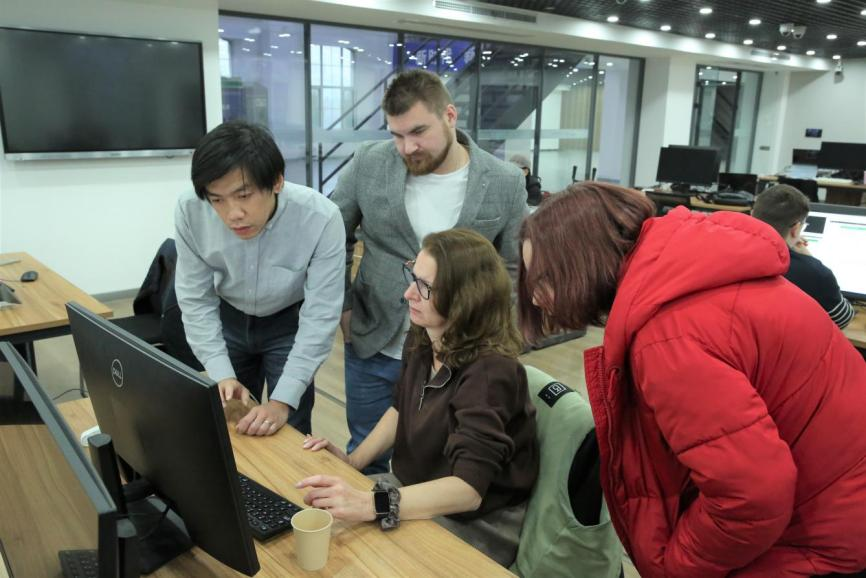 俄羅斯魯班工坊第七期EPIP師資培訓中,天津電子信息職業技術學院教師孫健(左一)與俄方教師進行云計算專題教學研討。(圖片由校方提供)
